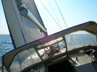 Partiamo, il mio amico Dante ed io, la mattina presto, verso le sei, con ancora in bocca il sapore dell’ultima moussaka gustata la sera prima in una taverna del porto. Poche miglia a motore per scapolare le ultime propaggini dell’isola e subito agganciamo il vento previsto, 20 nodi da nord che dovrebbero accompagnarci per circa 24 ore. La barca prende immediatamente il passo, l’andatura è di bolina larga, filiamo oltre i 7 nodi; per 11 metri sono una velocità di tutto rispetto. Una volta regolato il pilota automatico, non ci resta altro da fare che goderci la navigazione. L’indomani all’alba, come previsto il vento cala progressivamente fino a costringerci ad accendere il motore. Abbiamo percorso circa 140 miglia nelle 24 ore, una media che d’ora in avanti inevitabilmente si abbasserà.