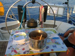 Accompagnati dal pigro scoppiettare dell’entrobordo, attraversiamo uno Ionio sempre più abbonacciato, a tratti uno specchio oleoso che riflette fastidiosamente i raggi del sole. Il caldo si fa sentire, decidiamo di fermarci, filare una cima a poppa legata ad un parabordo e farci un bagno. Lo scenario deserto, l’azzurro di cielo e mare e i 3000 metri d’acqua sotto di noi contribuiscono a rendere emozionante il momento. Nel pomeriggio quattro piccoli totani decidono di saltare a bordo, forse per sfuggire ad un predatore. Purtroppo per loro sono finiti nel posto sbagliato, li invitiamo a cena; un filo d’olio, uno spicchio d’aglio, qualche pomodorino ed il sugo per gli spaghetti è pronto in pochi minuti.