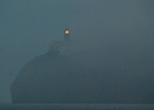 Per prepararmi ad affrontarlo mi ancoro nella piccola rada di Sagres, a 5 miglia dal promontorio, in attesa del momento favorevole per doppiarlo, studio e ristudio le previsioni da più fonti ed infine, quando ho adocchiato la finestra meteo buona, punto la sveglia alle 5 di mattina, la difficoltà supplementare è che dopo il capo non ci sono porti nè ridossi per circa 60 miglia, quindi la navigazione va fatta tutto d’un fiato per forza di cose. Quando mi sveglio, la sorpresa che non avrei mai voluto: la nebbia. E cavolo, proprio qui, proprio oggi! Mi faccio il caffè mentre mentalmente ragiono sul da farsi, fa anche freddo, quando esco in coperta sono tutto imbacuccato, con il pile pesante, la cerata completa e lo zuccotto di lana in testa. Mi guardo intorno, la nebbia non è fittissima, confido che col sorgere del sole la visibilità aumenti, salpo l’ancora e mi metto in rotta a velocità minima. Avvisto il faro avvolto nella foschia, oltre alla segnalazione luminosa emette quella sonora, il corno da nebbia, ad intervalli regolari, dando un tocco di ulteriore cupezza all’atmosfera. Incrocio un peschereccio, li saluto, ricambiano cordialmente, penso a quanto dura debba essere la vita del pescatore da queste parti, fa freddo ed è piena estate, non oso immaginare l’inverno. Il mare è abbastanza calmo, non ha senso allungare il percorso per tenermi distante dal Capo, sono ridossato il vento lo troverò subito dopo, continuo ad avanzare lentamente a motore, mentre la visibilità, come pensavo, gradualmente migliora. Calo la traina, attirando immediatamente un piccolo stormo di gabbiani che prende a volteggiare pericolosamente attorno all’esca, un pescetto finto ma incredibilmente realistico. Doppiato il capo, con una tranquillità che mai mi sarei aspettato, aggancio il vento previsto e prendo subito un bel passo, mentre un sole velato comincia a scaldare l’aria e la nebbia a diradarsi. Decido di lasciare solo il gennaker vista l’andatura al gran lasco, dell’aliseo portoghese per ora nessuna traccia.