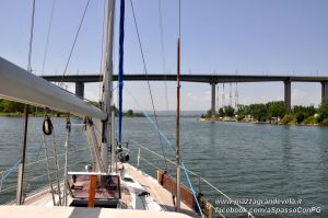 Prima di lasciare Varna voglio passare una notte all’ancora nel grande lago (o laguna) navigabile che si trova alle spalle della città e a questa collegato attraverso un canale accuratamente segnato con boe rosse e verdi. «Ma che ci vai a fare?», mi chiede Tony. Già, che ci vado a fare? Ci vado perché mi incuriosisce il posto e perché dopo tanti giorni di porto ho voglia di un ancoraggio solitario. Mollo le cime e mi infilo nel canale, passo sotto un alto ponte stradale e mentre faccio ancora una volta la sauna, visto che il leggerismo vento che c’è è esattamente da poppa e si annulla con quello di avanzamento, una grossa nave alle mie spalle avanza lungo il mio stesso percorso dandomi la sensazione di un cane che cerchi di mordermi il sedere; affondo quindi la manetta del gas e mi tolgo di mezzo. Una volta dentro questa sorta di laguna, inizio a gironzolare: ci sono alcuni piccoli cantieri navali, alcune baracche lungo le sponde, un piccolo marina e molte persone che pescano dalla riva. In lontananza si vedono un paio di grosse navi che stanno facendo carenaggio e qualche piccolo insediamento industriale. Nel frattempo noto che l’acqua ha un aspetto davvero terribile, probabilmente qualche scolo fognario finisce qui senza alcuna depurazione ma, nonostante ciò, un paio di moto d’acqua si rincorrono allegramente schizzandosi a vicenda come fossero in un mare paradisiaco anzichè in una sorta di lago fecale, così insalubre che perfino le meduse, organismi generalmente resistenti, sono tutte a testa in giù, evidentemente morte. Spero proprio di non avere necessità di tuffarmi per spedare l’ancora o liberare l’elica da qualche pezzo di plastica.