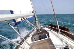 Non sempre, durante questa rotta, il vento e il mare mi sono stati favorevoli, anzi spesso mi sono trovato a percorrere lunghi tratti bordeggiando controvento oppure a motore. Solo una volta, nel golfo di Oristano, una forte maestralata mi ha costretto ad una sosta di tre giorni. divisa fra porto e rada (un meraviglioso ancoraggio di fronte alle rovine fenicie di Tharros). Tutto era comunque stato annunciato con largo anticipo, quindi nessun problema o difficoltà, se non l’impossibilità di fermarsi nel bel tratto di costa precedente, quello che va da Portoscuso a Capo Frasca, interamente esposto ai venti dei quadranti occidentali.