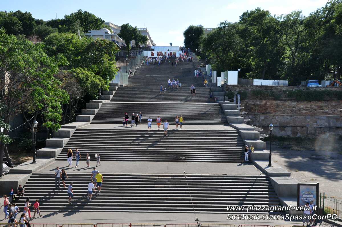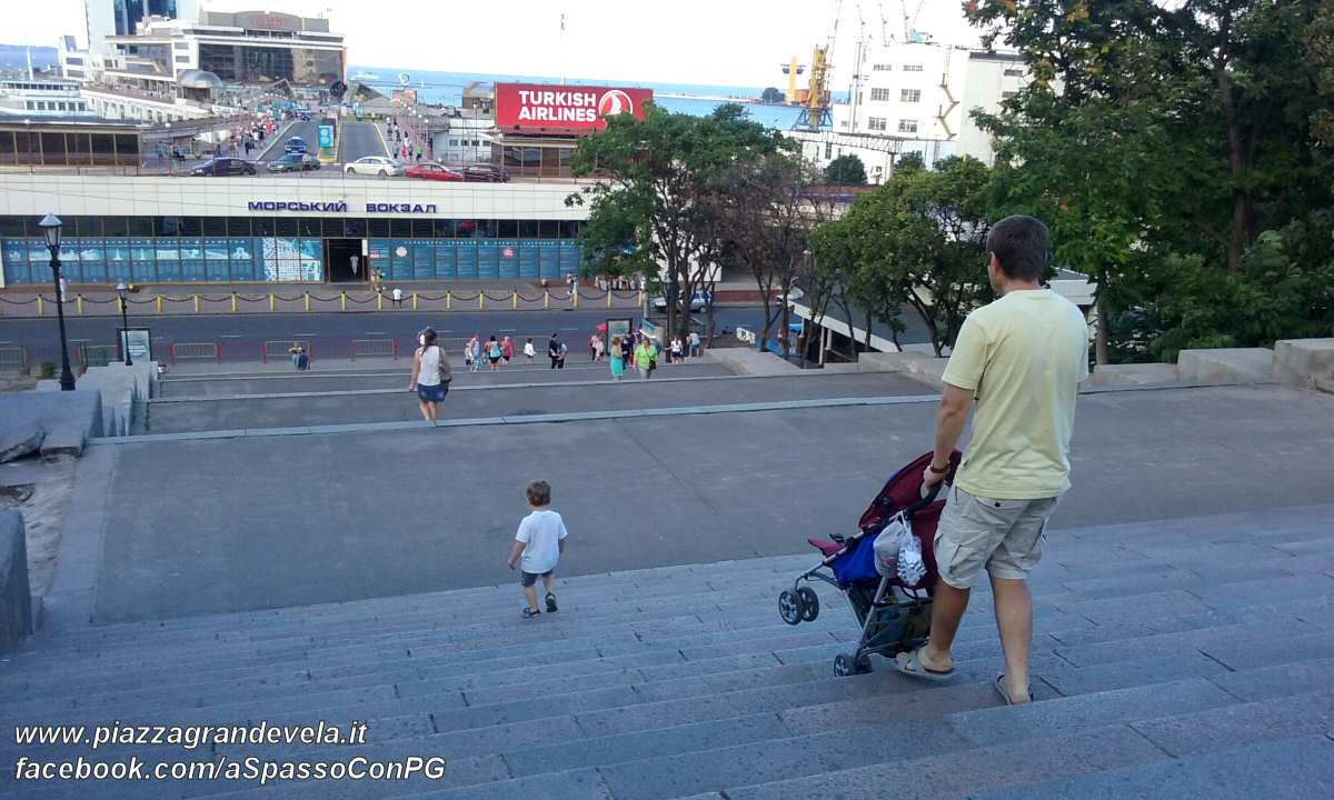 Cerco i cosacchi, cerco la carrozzina, cerco l’occhio della madre, ma vedo solo persone tranquille che passeggiano, osservano il bellissimo panorama sul porto e scattano foto e selfie in cui appariranno sorridenti su qualche social network. Lo so, non devo cadere nella trappola, non devo cercare i vecchi cliché superati dal tempo, ma provo a immaginare questo posto un secolo fa. Chiudo un attimo gli occhi e, quando li riapro, un’incredibile scena mi appare davanti: qualcuno sta spingendo una carrozzina giù dagli scalini. Allora è vero, è tutto ancora come l’ha raccontato Ejzenštejn, devo dirgli di fare attenzione, fra poco qui spareranno! Quando mi passa vicino, però, vedo che a spingerla è un uomo, l’occhio eventualmente è del padre, pure questo è un segno dei tempi. Evidentemente anche i costumi si sono aggiornati qui a Odessa, non solo le immagini, datate e stereotipate, che spesso ci portiamo dentro e pericolosamente continuiamo a cercare per ritrovare la realtà così come è fissata nella nostra mente.