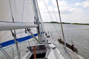Mi sveglio che sono appena le sei, il sole è sorto da poco e mi sembra di cogliere i segni di un vento favorevole, per altro annunciato dai bollettini meteo. La luce mi da l’esatta percezione del posto dove mi trovo: un’ampia baia dove regnano inconstrastati la natura ed il silenzio. Sulla riva, il verde degli alberi contorna una lunghissima lingua di sabbia completamente deserta. Solo in lontananza scorgo la sagoma di una nave, forse militare. Effettivamente, ieri notte ho sentito delle voci alla radio ma ho preferito ignorarle pensando che se non potevo fermarmi qui, che almeno fossero venuti di persona a mandarmi via. Recupero l’ancora e insieme tiro su qualche chilo di fango; la lascio quindi appesa al musone perché si sciacqui un po’ prima di riporla nel suo gavone. Poi imposto l’autopilota, metto a segno le vele e dopo qualche ora avvisto il faro di Sulina davanti alla mia prua. Il vento è sostenuto, non meno di venti nodi, ed entrare in un fiume la ritengo una delle manovre più rischiose che ci siano, per la quale ciascuno ha la sua tecnica preferita. La mia prevede motore su di giri, la sola vela di prua aperta e ancora libera da qualunque ritenuta, pronta ad essere calata in un attimo. Appena sulla destra dell’ingresso, giace sferzato dalle onde il relitto semiaffondato di un cargo, quasi a rammentare a chi passa di qui la pericolosità del luogo.