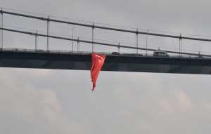 Quando finalmente l’aria si rischiara, il nuovo ponte in costruzione, il terzo che collega l’Europa e l’Asia, scorre sopra di noi: siamo dentro il canale. Malgrado l’ora, diverse squadre di operai sono già al lavoro; lo prendo come un buon segno, un segnale che la normale vita quotidiana sta riprendendo. Una bandiera turca di dimensioni davvero gigantesche sventola attaccata agli enormi cavi d’acciaio che sostengono il viadotto e il vento la scuote producendo uno schiocco secco ogni volta che una raffica la distende. La bandiera in Turchia è sempre stata il simbolo dei kemalisti ed è presente veramente ovunque. Non ho mai visto un’altra nazione con così tante bandiere, sugli edifici istituzionali ma anche sulle colline e negli agglomerati urbani. Sempre nuove, curatissime, di un rosso brillante. I sostenitori di Erdoğan, che in questi giorni hanno invaso le piazze delle città spronati dal loro leader, sventolano anche loro la bandiera con la mezzaluna. Sembrano voler dire di essersi impossessati anche di questo simbolo piuttosto che rifiutarlo in quanto emblema della parte avversa. E allora le bandiere appese oggi, a questo come ai successivi ponti, non capisci più chi le ha messe né cosa vogliano effettivamente comunicare.