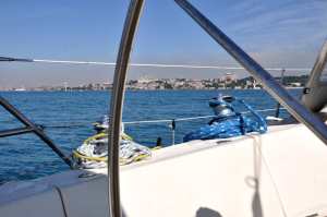 Nel primo pomeriggio agganciamo la corrente del Bosforo e la velocità sale oltre i sette nodi: troppo, rischiamo di arrivare all’ingresso dello stretto prima dell’alba, cosa che voglio evitare assolutamente. Prima di cena metto alla cappa e ci facciamo un bel bagno in mare e una doccia rinfrescante, poi ripartiamo con velatura ridotta per rallentare l’andatura. Nella notte incrociamo solo qualche nave distante che dirige, come noi, verso il Bosforo ma provenendo da nord, forse dalla Russia. In lontananza si intravedono le luci della costa, oltre al bagliore di Istanbul che anche da questo lato rischiara il cielo a decine di miglia di distanza. E poi le stelle, tante, a brillare nel cielo fino a quando un quarto di luna vermiglio non le spegne riflettendosi sulla superficie del mare.