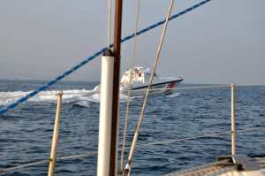 Accidenti, parlano di me! Ma con chi? Dopo poco mi sento chiamare sul canale 16: è sempre la nave lungo la mia rotta e mi fanno una serie di domande sulla mia posizione, la mia destinazione, il mio numero di registro, le persone a bordo… Strano, molto strano. Cerco di rispondere in modo cortese ma evasivo, poi ho l’impressione che riferiscano le informazioni raccolte a qualcuno di cui però non ricevo il segnale. Comunque sia, non ho nulla da nascondere e sono un libero cittadino che solca le libere acque di un libero stato. Spero che le stesse parole non debba ripeterle il mio avvocato durante il processo!