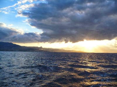 Nello Stretto di Messina mi sento veramente a casa e di casa, vuoi perché ormai l’ho percorso a vela diverse volte, vuoi soprattutto perché qui per molti anni sono venuto in vacanza da piccolo con i miei e qui conservo ancora alcuni amici di infanzia. Ad uno di essi, Enzo, non manco mai di fare visita quando navigo da queste parti. Abita a pochi chilometri dalla città, quasi sul mare, io mi ancoro proprio davanti casa sua e lui puntualmente mi invita a cena, mi offre di fare il bucato, mi accompagna a fare la spesa, eccetera. L’anno scorso appena mi ha visto mi ha chiesto se avevo bisogno di una doccia, ed io avevo addosso solo un giorno di mare. Oggi che ne ho tre, al fine di evitare antipatici spargimenti olfattivi in casa d’altri, mi do una bella lavata sulla spiaggetta di poppa prima di telefonargli per sentire se c’è. La prima volta che ho fatto lo Stretto a vela mi sono documentato, ho cercato le tabelle di corrente, ho chiesto a persone del posto. Alla fine ho capito che per una barca moderna Scilla e Cariddi sono un ostacolo tutto sommato modesto e stavolta mi ci infilo dentro senza aver avuto il tempo di informarmi di nulla. Credo che abbiamo preso una giornata di stanca, tutto è regolato dalle fasi lunari, avanziamo spediti bordeggiando fra le due sponde e non ho mai la sensazione di aver agganciato correnti favorevoli nè sfavorevoli. Solo all’altezza di Villa San Giovanni, dopo una virata per smarcarci dai mille traghetti, guardo la traccia sul GPS e mi accorgo che abbiamo disegnato un cerchietto, in pratica nel poco tempo in cui abbiamo perso abbrivio per la vira, siamo stati ributtati indietro di qualche metro. Enzo mi conferma telefonicamente che stasera sarà in casa, di solito quando mi metto alla fonda viene a prendermi con il suo gozzo, ma è giorno lavorativo, non è proprio il caso di scomodarlo a tal punto, gli do appuntamento in spiaggia, e quando diamo ancora armiamo il tender per prepararci allo sbarco. S’è ormai fatta notte e c’è onda, proviamo a mettere il motore ma il rischio che cada in mare è veramente alto, lasciamo perdere, andremo a remi. La scena è di quelle che restano impresse, solo noi davanti ad una spiaggia buia, su un battellino di due metri, in una mano ho il remo e nell’altra una torcia con cui illumino per farmi vedere, casomai passasse qualche altro folle come noi. A pochi metri dalla battigia ci prepariamo alla sbarco, uno sbarco che l’onda rende un po’ problematico, i Navy Seals americani o i Marò San Marco sicuramente sono meglio addestrati di noi a queste situazioni, perchè appena siamo con la prua a riva il tender si traversa e finiamo in acqua mentre tentiamo di guadagnare la riva. Perfetto, tanto è soltanto notte e fa freddo, che importa se stiamo con i vestiti zuppi addosso! Saluto Enzo, il tempo di scambiare due chiacchiere, poi rimettiamo a mare il battellino e torniamo a bordo prima di rischiare il cimurro.
