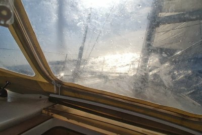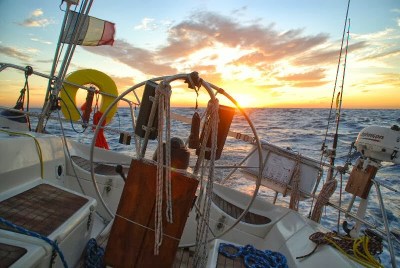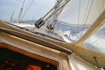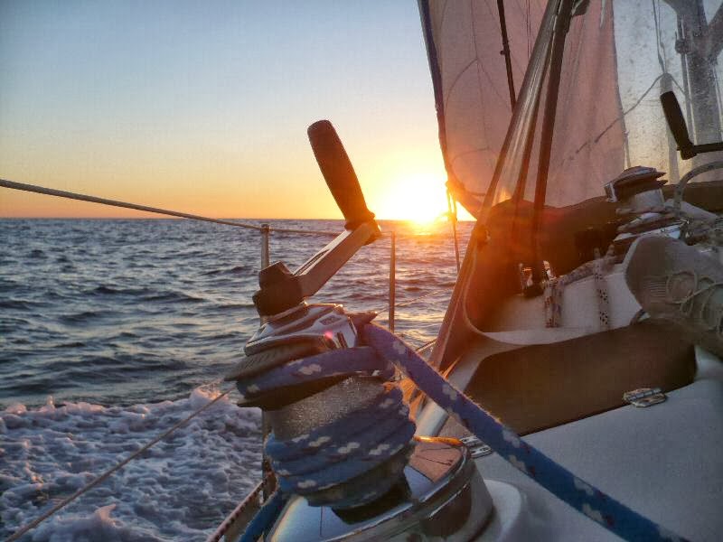 Quando sorge il sole, assistiamo ad un’alba strepitosa, uno spettacolo mozzafiato fatto di rosso, di azzurro, di nuvole, di cielo e mare, solo mare, nient’altro che mare attorno a noi, per 360 gradi all’orizzonte. Immortalo l’attimo, sia con la macchina fotografica che con gli occhi, questo secondo scatto proverò a recuperarlo mentalmente ogni volta che mi troverò in fila nel traffico quando sarò rientrato a Roma. Nel traffico? Dimentico che prima di partire, quattro mesi fa, ho venduto la macchina! Finito lo show di madre natura, accendo il motore per ricaricare un po’ le batterie e mi concentro sulla navigazione. Il vento è aumentato parecchio, è sui venticinque nodi, siamo di bolina anche se non stretta al massimo, ho ridotto ancora la randa e anche un po’ di genova, abbiamo un assetto ottimo e Piazza Grande galoppa favolosamente a sette nodi. L’onda è lunga, come si conviene all’alto mare, spero non sia l’araldo che annuncia la burrasca dato che i frangenti non sono molti. Questi, però, arrivano a metà mattinata, ogni tanto qualcuno giunge proprio a domicilio e se non siamo lesti a rannicchiarci sotto lo sprayhood la doccia è assicurata. Ciò accade quando si incrociano due onde, la prima alza la prua e la seconda la colpisce quando si sta riabbassando, è divertente guardare gli spruzzi d’acqua correre in orizzontale sulla coperta spinti dal vento, molto meno divertente vederne arrivare qualche propaggine dal tambuccio, cosa che avviene purtroppo un paio di volte, per fortuna poca roba. Dopo un paio d’ore mi persuado che più di così il mare non monterà, non che sia poco, ma mi pare una situazione stabile ed in linea con le previsioni scaricate il giorno prima. Di più aggiornate non ne abbiamo, almeno non dettagliate come i Grib. Piccola parentesi tecnica: i Grib sono dei file compressi che si scaricano molto velocemente da Internet e si visualizzano con un software apposito, l’intera operazione è completamente gratuita. Il limite dei Grib è che non tengono conto dei fenomeni locali, dell’orografia e quant’altro, ma per il mare aperto li ritengo molto affidabili, come ho potuto sperimentare più volte. Ovviamente, in assenza di segnale Internet è impossibile scaricarli, quindi arriveremo in Calabria con il file di due giorni prima.